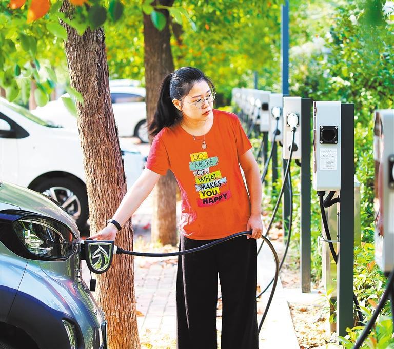 ◀9月8日,河南驻马店市一小区新能源充电站,市民通过扫码等操作,为汽车充电。该市加大新能源汽车充电桩建设,目前县域实现全覆盖。