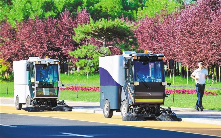 ▲7月6日,自动驾驶清扫车在内蒙古鄂尔多斯市康巴什区街头作业。目前,自动驾驶观光巴士、自动驾驶售卖车、自动驾驶清扫车以及网联化车辆已在该市主要街道投入使用。