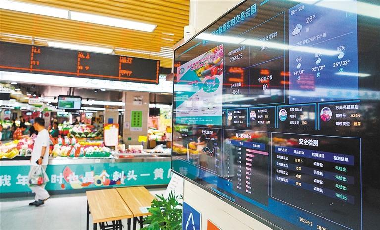 ▲9月2日,浙江嘉兴市南湖区南江路农贸市场内悬挂的“智慧农贸大数据实时交易云图”滚动播出各种数据。近年来,当地全面打造“智慧菜场”,依托互联网和大数据为农贸市场的服务和商品安全赋能。