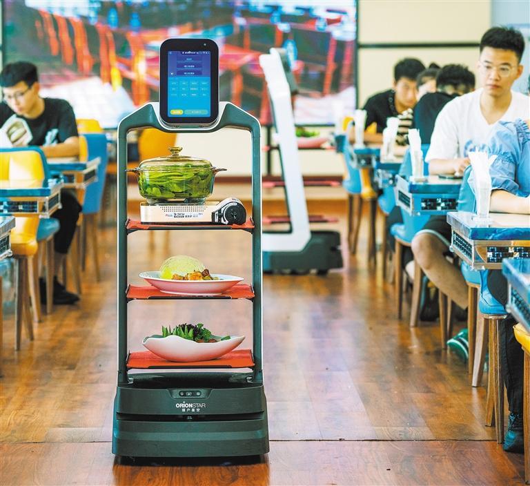 ▶9月8日,在河北唐山市曹妃甸区一家餐厅,机器人正在给顾客送餐。服务业机器人投入使用后,既省时又省力。