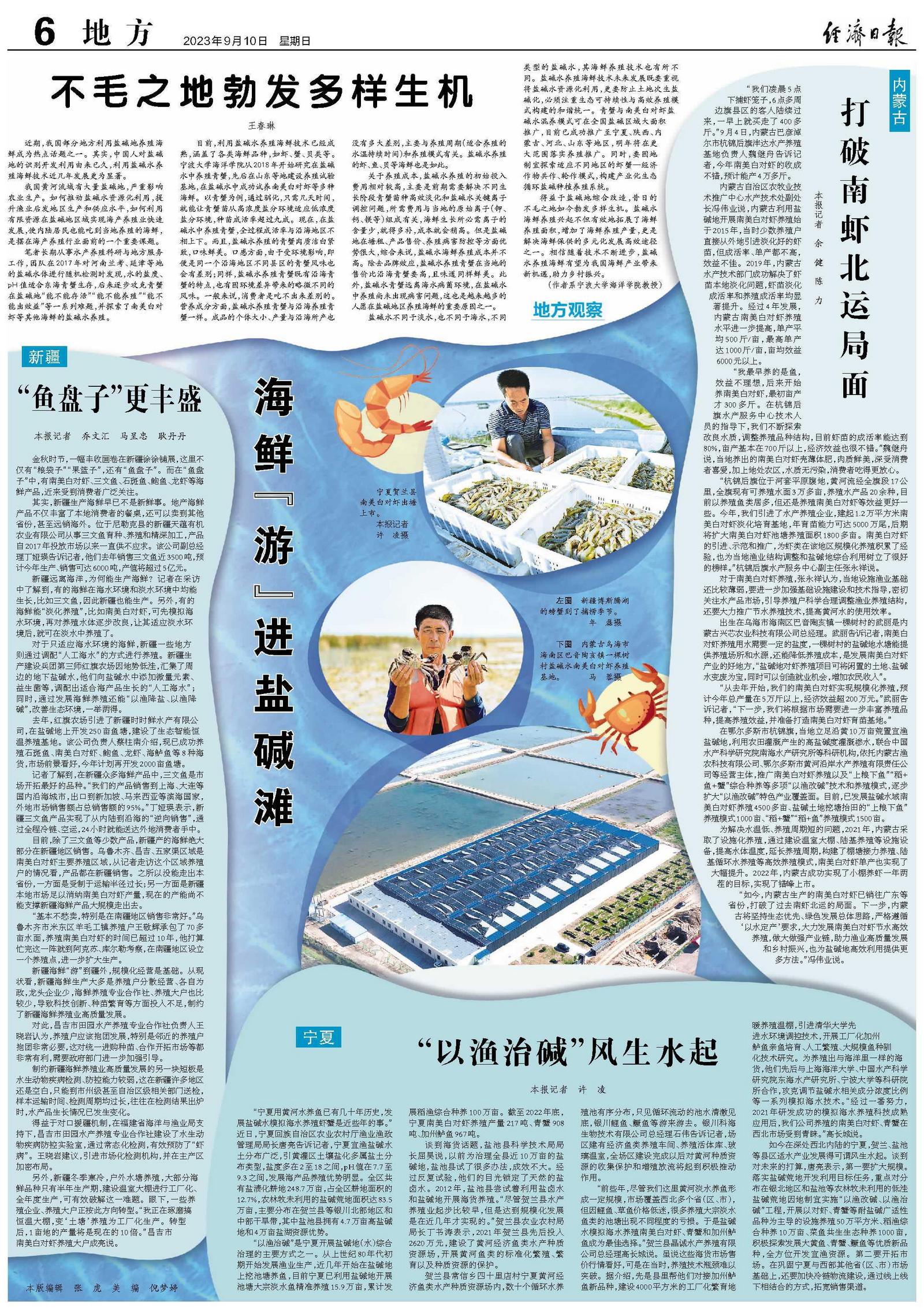 如今在深处西北内陆的宁夏,贺兰、盐池等县区适水产业发展得可谓风生水起。谈到对未来的打算,唐亮表示,第一要扩大规模。落实盐碱荒地开发利用目标任务,重点对分布在银北地区和盐池等农林牧未利用的低洼盐碱荒地因地制宜实施“以渔改碱、以渔治碱”工程,开展以对虾、青蟹等耐盐碱广适性品种为主导的设施养殖50万平方米、稻渔综合种养10万亩、菜鱼共生生态种养1000亩,积极探索发展大黄鱼、青蟹、鳜鱼等优质新品种,全方位开发宜渔资源。第二要开拓市场。在巩固宁夏与西部其他省(区、市)市场基础上,还要加快冷链物流建设,通过线上线下相结合的方式,拓宽销售渠道。