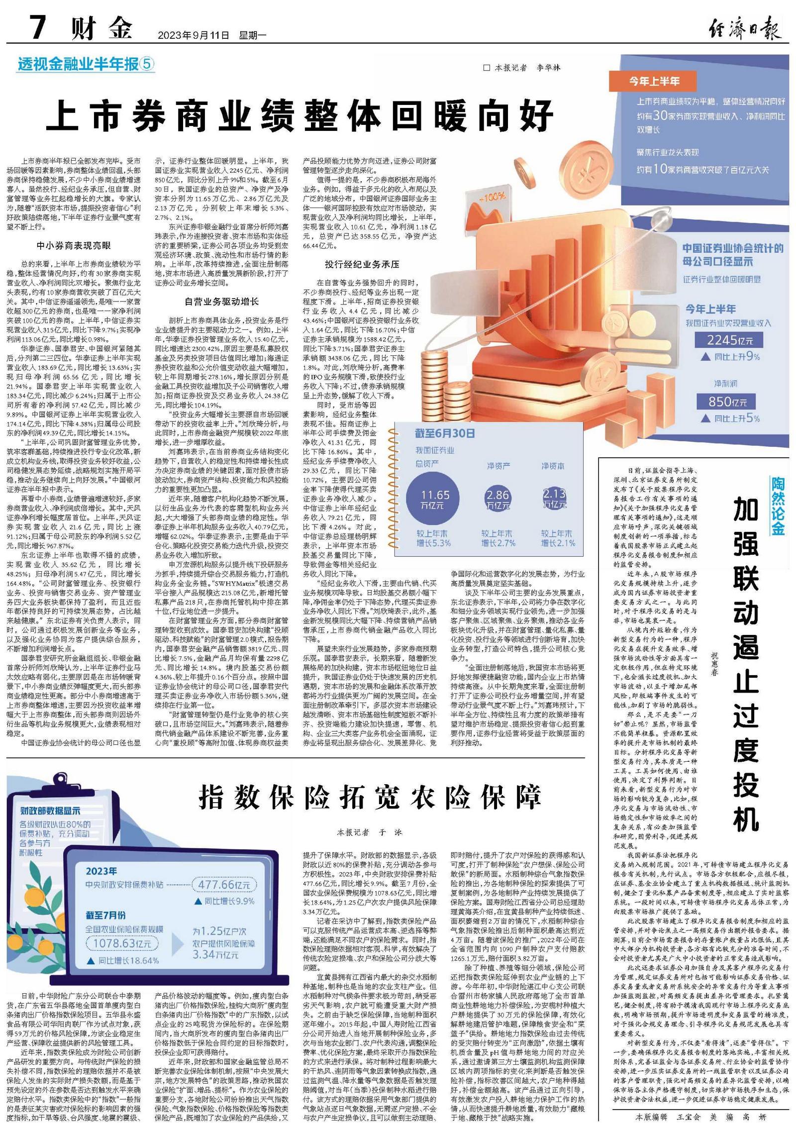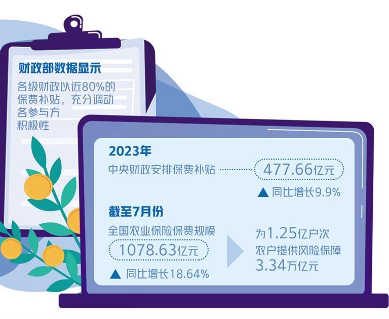 近年来,财政部和国家金融监管总局不断完善农业保险体制机制,按照“中央发展大宗,地方发展特色”的政策思路,推动我国农业保险“扩面、增品、提标”。作为农业保险的重要分支,各地财险公司纷纷推出天气指数保险、气象指数保险、价格指数保险等指数类保险产品,既增加了农业保险的产品供给,又提升了保障水平。财政部的数据显示,各级财政以近80%的保费补贴,充分调动各参与方积极性。2023年,中央财政安排保费补贴477.66亿元,同比增长9.9%。截至7月份,全国农业保险保费规模为1078.63亿元,同比增长18.64%,为1.25亿户次农户提供风险保障3.34万亿元。