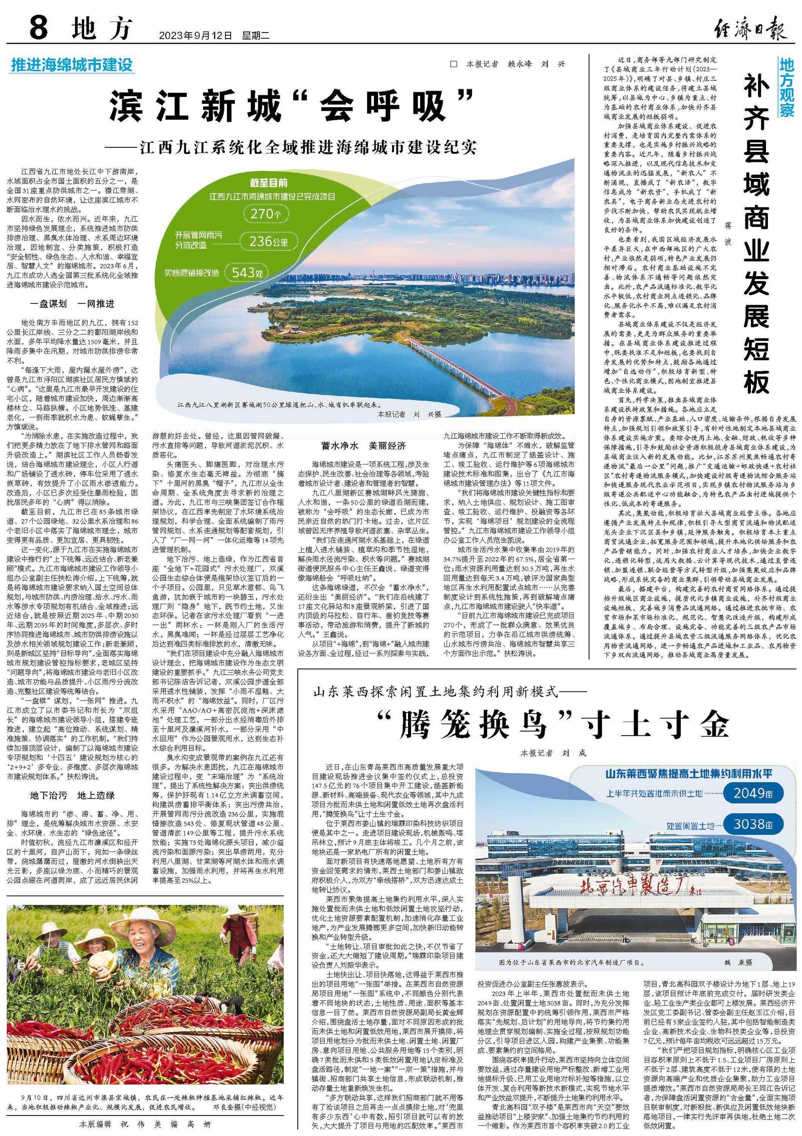 城市生活污水集中收集率由2019年的34.7%提升至2022年的67.5%,居全省第一位;雨水资源利用量达到30.5万吨,再生水回用量达到每天3.4万吨,被评为国家典型地区再生水利用配置试点城市……从完善制度设计到系统性施策,再到破解堵点痛点,九江市海绵城市建设驶入“快车道”。