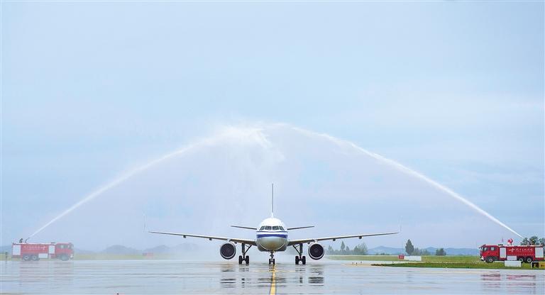 9月12日,四川省阆中市阆中古城机场,中国国际航空公司空客A319飞机通过“水门”。当日,该飞机飞抵阆中市,对古城机场进行了实地验证试飞并取得成功,标志着古城机场向正式通航又迈进了一大步。王玉贵摄(中经视觉)