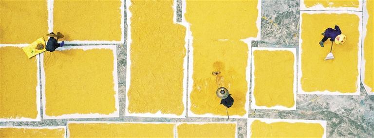 9月10日,村民在贵州省从江县刚边壮族乡三联村广场翻晒稻谷。近日,当地将党群服务中心、村级篮球场等场地设为临时晾晒点,便利群众秋粮收获及晾晒,确保颗粒归仓。