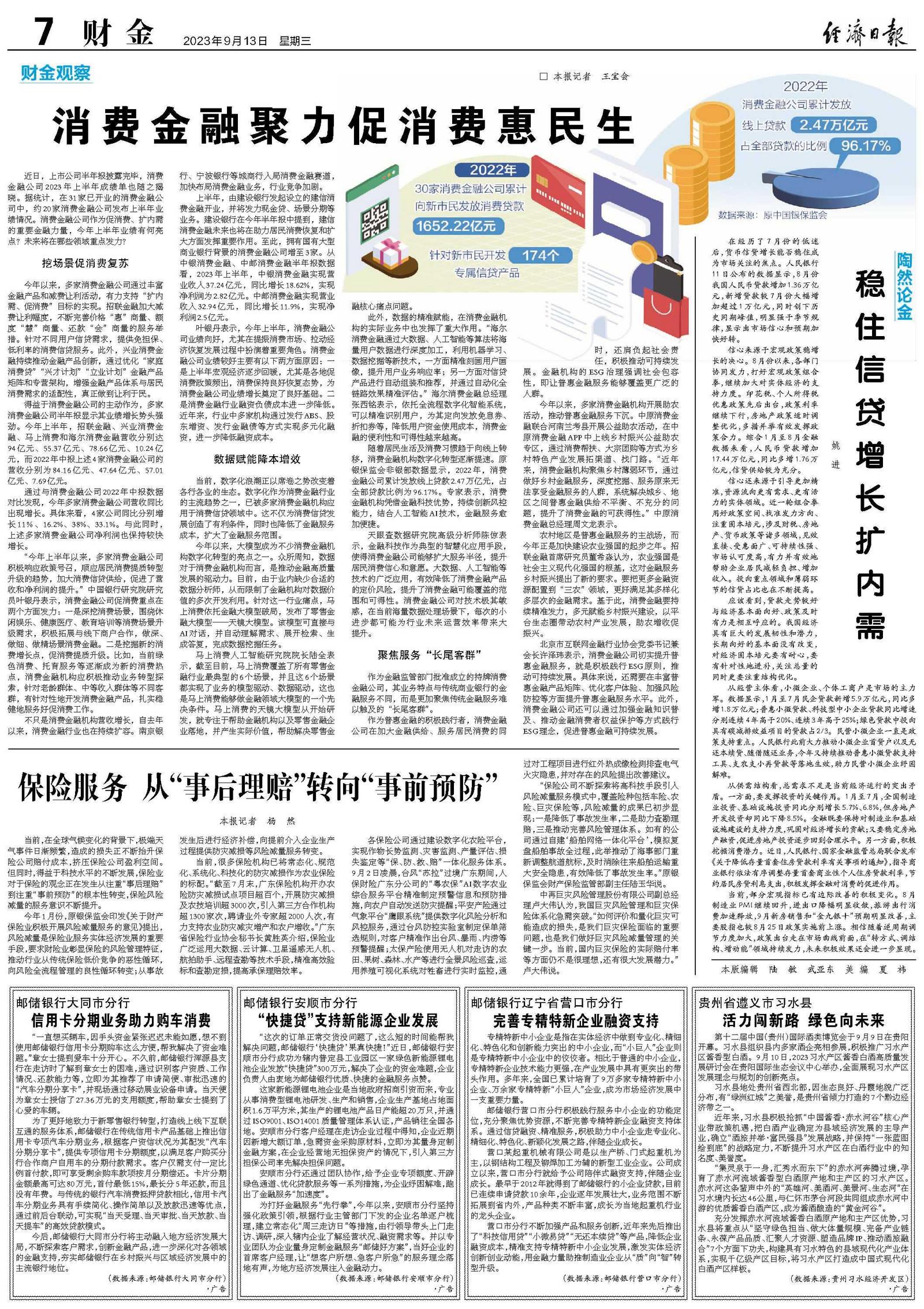 “今年上半年以来,多家消费金融公司积极响应政策号召,顺应居民消费提质转型升级的趋势,加大消费信贷供给,促进了营收和净利润的提升。”中国银行研究院研究员叶银丹表示,消费金融公司促消费重点在两个方面发力:一是深挖消费场景,围绕休闲娱乐、健康医疗、教育培训等消费场景升级需求,积极拓展与线下商户合作,做深、做细、做精场景消费金融。二是挖掘新的消费增长点,促消费提质升级。比如,当前绿色消费、托育服务等逐渐成为新的消费热点,消费金融机构应积极推动业务转型探索,针对老龄群体、中等收入群体等不同客群,有针对性地开发消费金融产品,扎实稳健地服务好促消费工作。