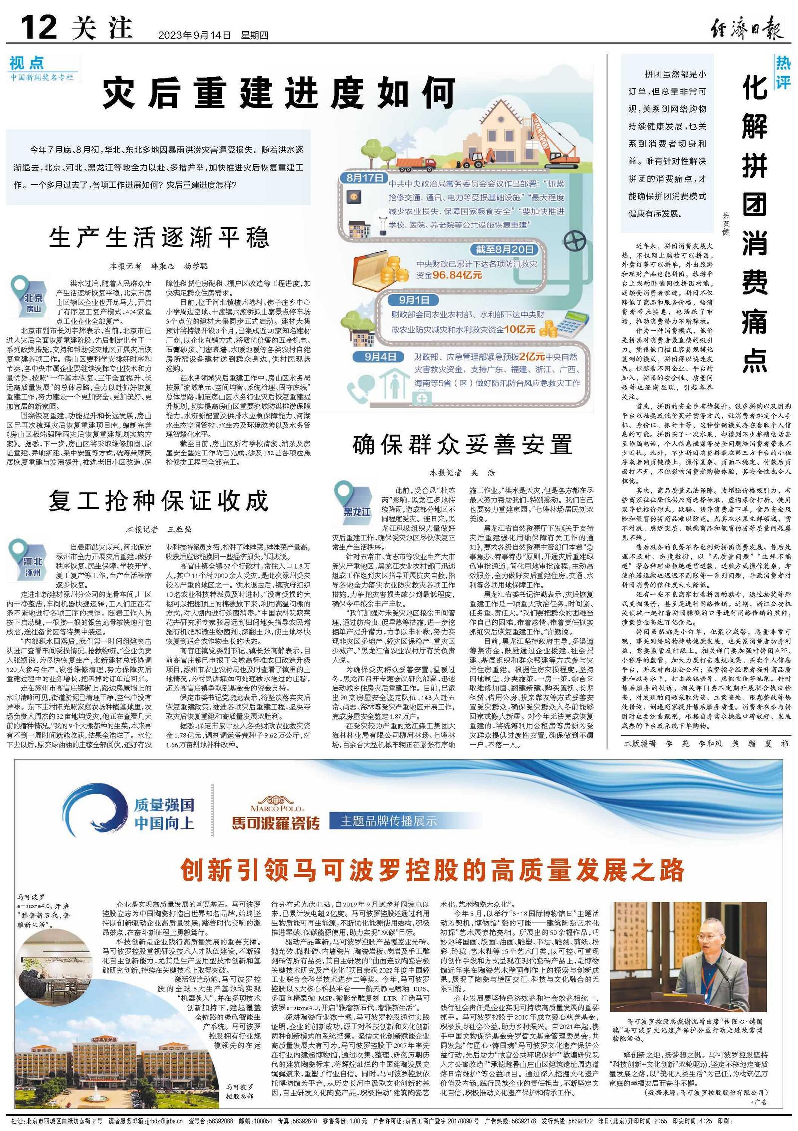 “内部积水回落后,我们第一时间组建突击队进厂查看车间受损情况、抢救物资。”企业负责人张凯说,为尽快恢复生产,北新建材总部协调120人参与生产、设备维修清理,努力保障灾后重建过程中的业务增长,把丢掉的订单追回来。