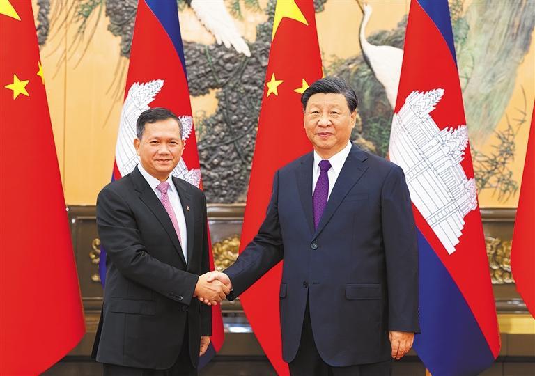 习近平强调,中方坚定支持柬埔寨探索符合本国国情的发展道路,愿同柬方保持经常性战略沟通,深化治国理政经验交流。双方要发挥好政府间协调委员会机制作用,落实好新版中柬命运共同体行动计划,充实中柬“钻石六边”合作架构,共建“工业发展走廊”和“鱼米走廊”,推动有关重点合作事项早日落地见效。中方愿同柬方常态化开展执法安全合作,持续打击网络赌博、电信诈骗等跨境犯罪。双方要继续办好“中柬友好年”系列活动,扩大两国青年、地方、教育、旅游、医疗卫生等领域合作,让中柬友好为两国人民带来更多福祉。