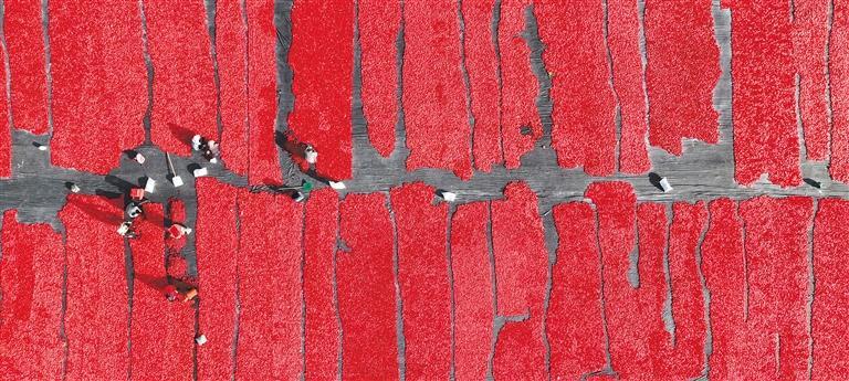 9月14日,新疆和静县巴润哈尔莫敦镇浩圆农产品专业合作社,村民在晾晒番茄。今年,当地番茄种植面积达36900亩,番茄干将出口到巴西等国家。