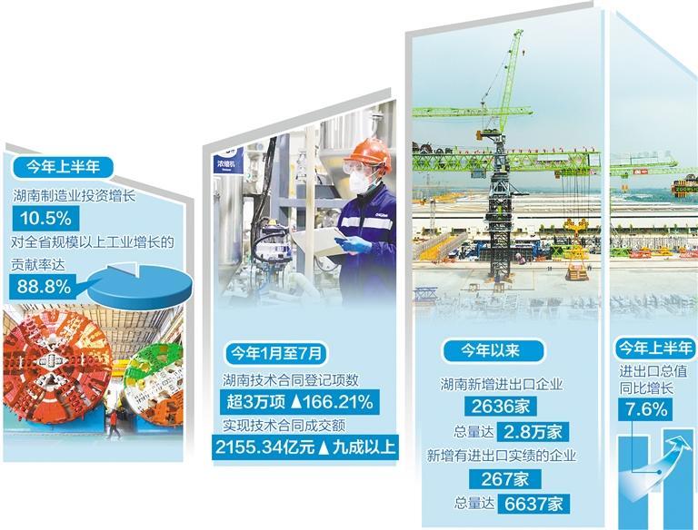数据显示,上半年,湖南制造业投资增长10.5%,增幅居全国前列;规模以上工业增加值同比增长2.6%,其中,制造业对全省规模以上工业增长的贡献率达88.8%,有力支撑了湖南的经济增长。“制造业高质量发展,是湖南经济高质量发展的重中之重。我们要紧盯先进制造业这个主攻方向,持续巩固提升优势产业,大力培育战略性新兴产业,前瞻布局未来产业,加快建设具有湖南特色的先进制造业产业体系。”湖南省委书记沈晓明说。
