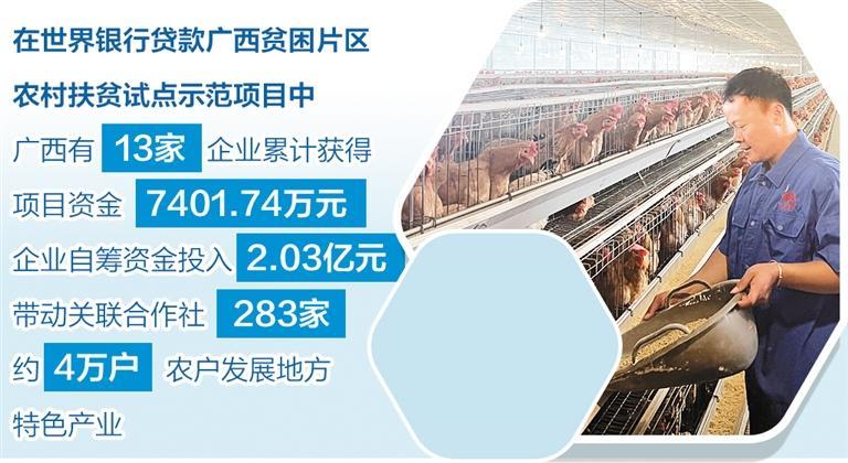 据统计,在世行贷款项目中,广西有13家企业累计获得项目资金7401.74万元,企业自筹资金投入2.03亿元,带动283家关联合作社、约4万农户发展地方特色产业。