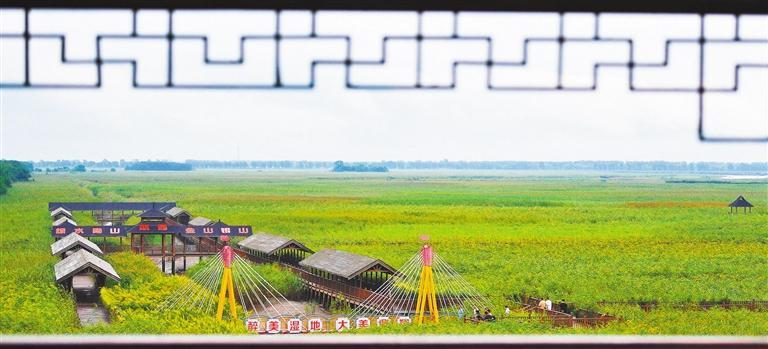 ▼盘锦市鼎翔生态旅游区的湿地吸引了众多游人前来观景。