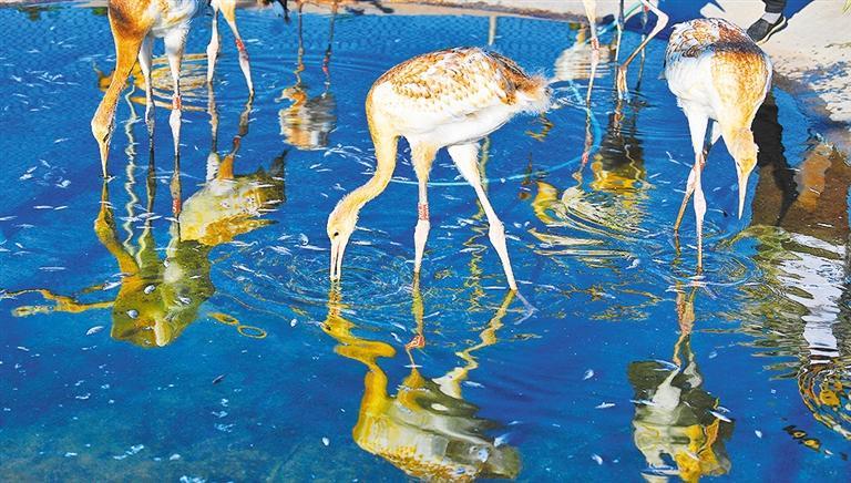▼盘锦市鹤类种源繁育基地,人工孵化的小丹顶鹤在觅食。随着生态环境的持续向好,辽河口湿地丹顶鹤、黑嘴鸥等珍稀鸟类数量成倍增长。