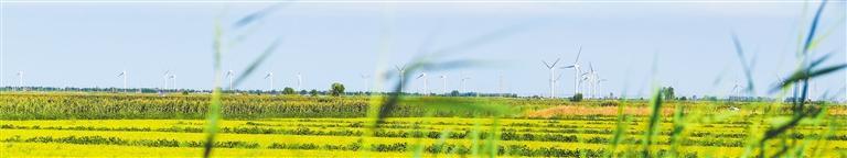 ▼盘锦市辽河岸风车摆开“雁阵”。翠绿的苇海、金色的稻田,与之相映成趣。新能源产业为盘锦低碳发展注入绿色动能。