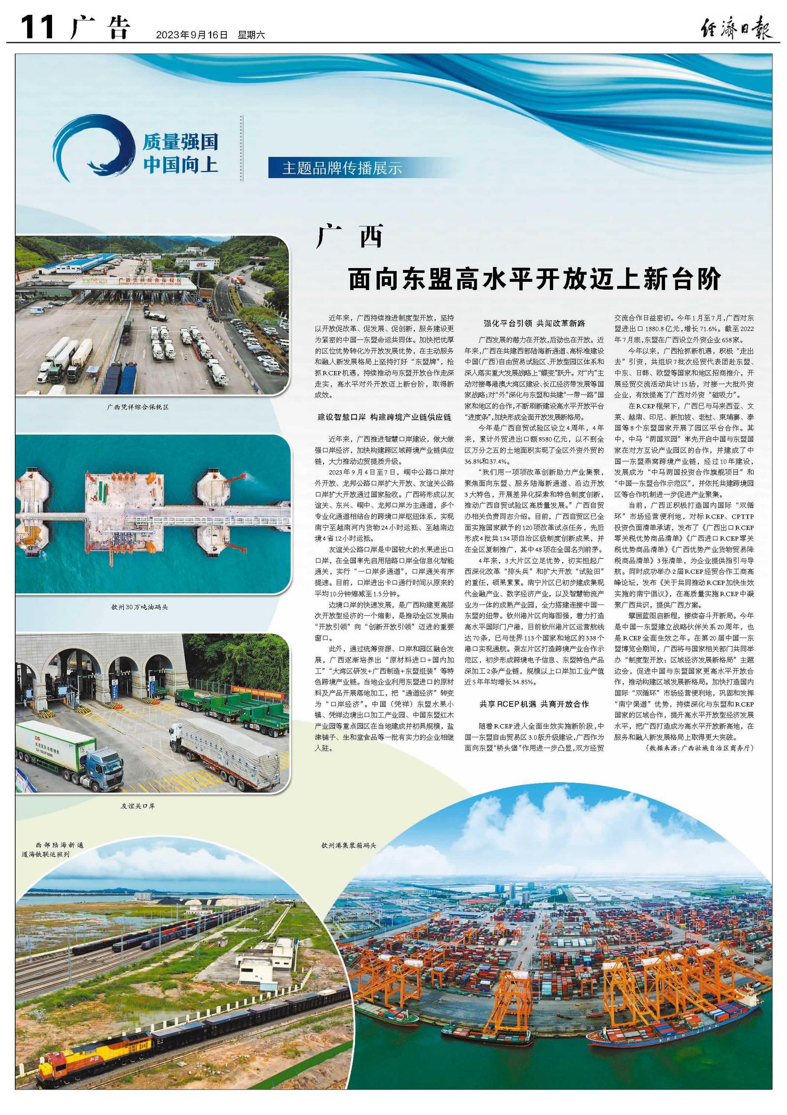 广西发展的潜力在开放,后劲也在开放。近年来,广西在共建西部陆海新通道、高标准建设中国(广西)自由贸易试验区、开放型园区体系和深入落实重大发展战略上“蝶变”跃升。对“内”主动对接粤港澳大湾区建设、长江经济带发展等国家战略;对“外”深化与东盟和共建“一带一路”国家和地区的合作,不断刷新建设高水平开放平台“进度条”,加快形成全面开放发展新格局。