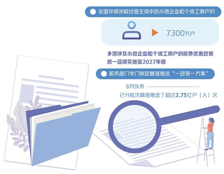 今年8月,国家税务总局再推出和优化五方面28条便民办税缴费举措,重点聚焦以民营企业为主体的广大中小微企业和个体工商户所盼,促进新出台的一系列延续、优化、完善的税费优惠政策更好落实落细。其中包括完善减税降费红利账单推送机制,优化改进系统功能,探索开展红利账单个性化、定制化推送服务;针对小规模纳税人减免增值税优惠、小型微利企业和个体工商户所得税优惠等政策,加大自主申报、自行享受的落实力度,不断拓展适用范围等多项务实举措。