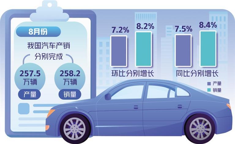 中国汽车工业协会数据显示,8月份,我国汽车产销同比环比实现双增长,产销继续保持恢复态势。在促消费政策及车企优惠促销等多种因素驱动下,购车需求持续释放,汽车市场整体呈现“淡季不淡”特点。