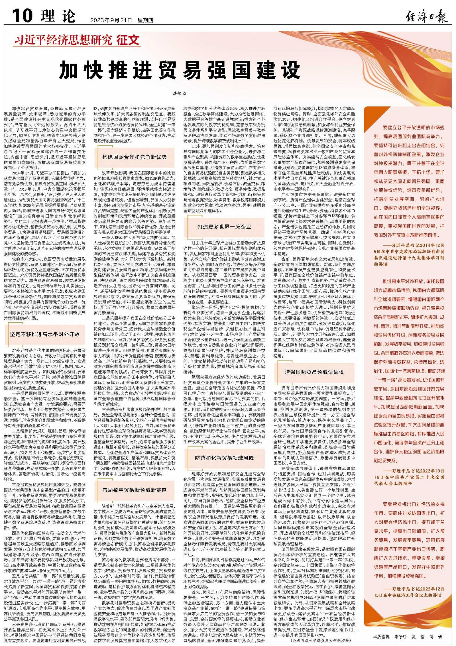 党的十八大以来,我国贸易高质量发展取得历史性成就,贸易大国地位不断巩固,贸易结构不断优化,贸易效益显著提升,正在向贸易强国迈进。未来贸易仍将是我国经济高质量发展的重要动力。加快建设贸易强国,需要理论指导和前瞻谋划,也需要精准布局并扎实推进。要坚定不移推进高水平对外开放,积极构建国际合作和竞争新优势,加快布局数字贸易等新领域、新赛道,打造具有国际竞争力的世界一流企业,守牢安全底线和防范化解风险,增强我国在国际贸易领域的话语权,不断以中国新发展为世界提供新机遇。