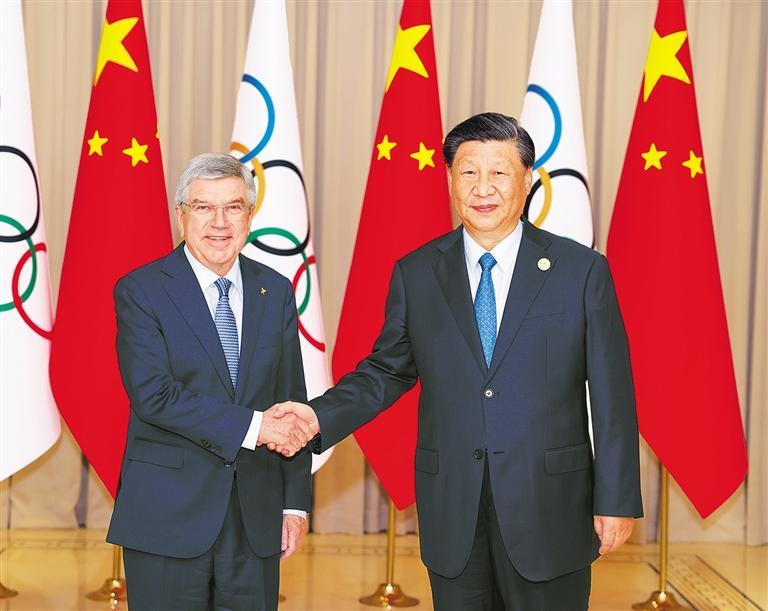 习近平强调,中国一贯重视发展体育事业,积极参与国际奥林匹克事务,践行“更快、更高、更强——更团结”的奥林匹克格言。去年中国克服新冠疫情等挑战,向世界奉献了一届“简约、安全、精彩”的北京冬奥会,北京成为全球首个“双奥之城”。中国传播奥林匹克精神的脚步永不停歇,愿同国际奥委会一道,坚持体育非政治化原则,充分利用北京冬奥会遗产,为推进奥林匹克事业和构建人类命运共同体作出新的更大贡献。目前,杭州亚运会的准备工作已经就绪。中国政府和中国人民完全有信心呈现一届“中国特色、亚洲风采、精彩纷呈”的体育盛会,为推动奥林匹克运动发展、促进亚洲人民团结和友谊作出新的贡献。