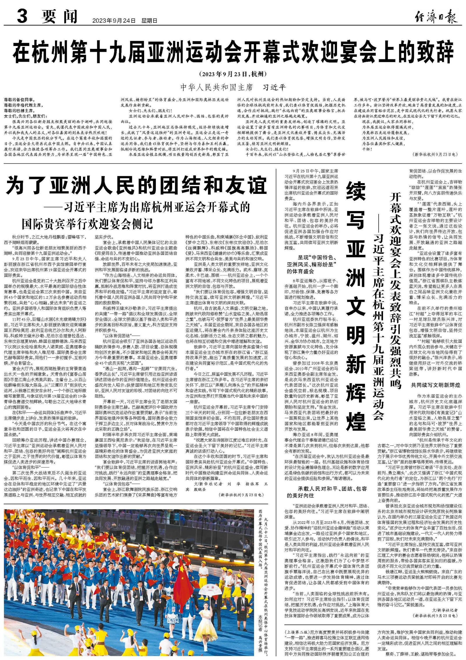 本届亚运会报名规模、项目数量均创历史新高,彰显了亚洲人民对杭州亚运会的热切期盼和坚定支持。当前,人类面临的全球性挑战前所未有,我们要以体育促团结,把握历史机遇,合作应对挑战,践行“永远向前”的亚奥理事会格言,把共同发展、开放融通的亚洲之路越走越宽。
