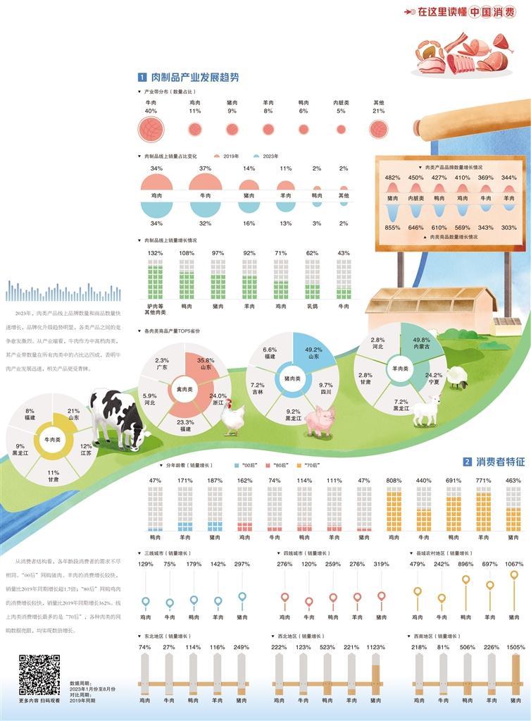 线上肉类品牌化发展迅速。数据显示,2023年1月份至8月份,肉类品牌数量比2019年同期增长363%。各大传统肉类企业向“数字化供应链+全渠道销售”的新模式转变,极大增加了线上优质肉类供给。同时,为了适应人们对高品质肉类的消费需求,生鲜企业推出了更多有机、无抗地标优质农产品,肉制品企业也积极研发,将健康与美味结合,推出了很多无添加、减盐肉制品,受到消费者欢迎。