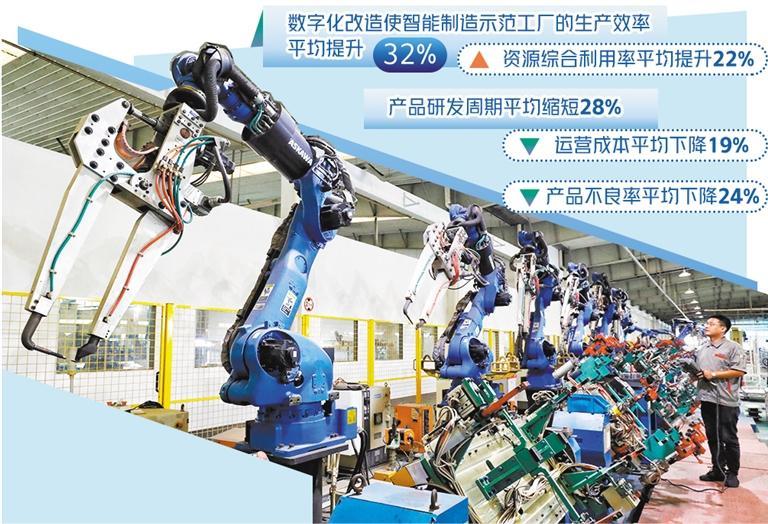 数字技术加速向各行业各领域广泛渗透、深度融合,融合重点正从消费服务领域转向生产制造领域,促进各类资源要素的网络化泛在互联、服务化弹性供给、平台化高效分配,推动发展方式、产业模式、企业形态的深刻变革。数据显示,数字化改造使智能制造示范工厂的生产效率平均提升32%,资源综合利用率平均提升22%,产品研发周期平均缩短28%,运营成本平均下降19%,产品不良率平均下降24%。