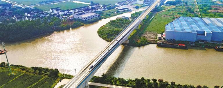 9月28日,沪宁沿江高铁建成通车,上海与南京间再增加一条城际高速铁路“大动脉”。图为列车飞驰在沪宁沿江高铁跨疏港特大桥上。