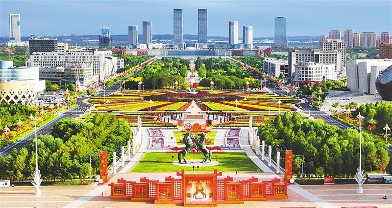 9月27日拍摄的内蒙古自治区鄂尔多斯市康巴什区街景。中秋节、国庆节到来之际,当地街头花团锦簇,处处洋溢着喜庆氛围。王 正摄(中经视觉)