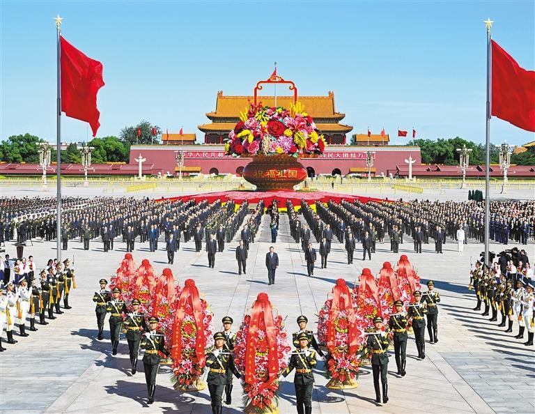 方阵前,以中共中央,全国人大常委会,国务院,全国政协,中央军委,各民主党派、全国工商联和无党派爱国人士,各人民团体和各界群众,老战士、老同志和烈士亲属,中国少年先锋队名义敬献的9个大型花篮一字排开,花篮红色缎带上书写的“人民英雄永垂不朽”格外醒目。