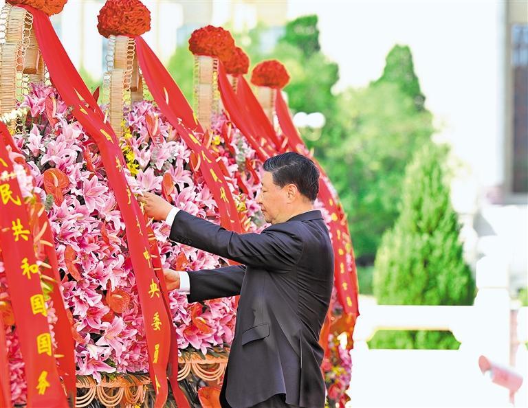 习近平迈步上前,仔细整理花篮缎带。随后,习近平等党和国家领导人缓步绕行,瞻仰人民英雄纪念碑。