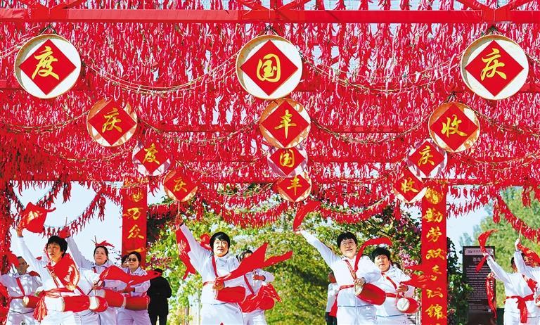 10月1日,河北省迁安市腰鼓队在表演节目。中秋国庆假期,全国各地的景区景点纷纷开展丰富多彩的节庆活动,让广大游客乐享多彩假日生活。梁玉水摄(中经视觉)
