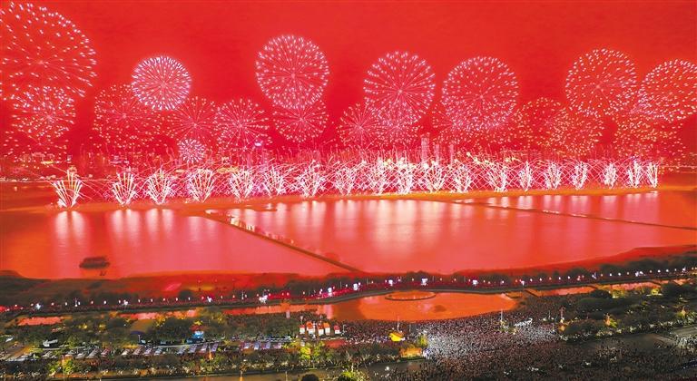 10月1日晚,江西省南昌市国庆烟花晚会在赣江老官洲上演,璀璨焰火为祖国送上祝福。马 悦摄(中经视觉)