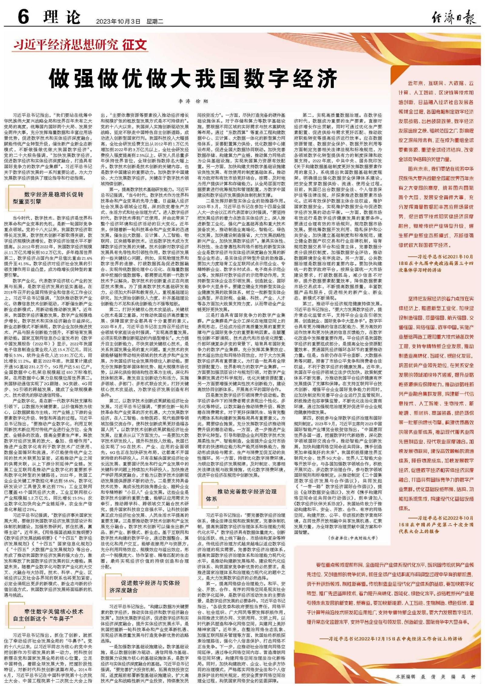 习近平总书记指出,“我们要站在统筹中华民族伟大复兴战略全局和世界百年未有之大变局的高度,统筹国内国际两个大局、发展安全两件大事,充分发挥海量数据和丰富应用场景优势,促进数字技术和实体经济深度融合,赋能传统产业转型升级,催生新产业新业态新模式,不断做强做优做大我国数字经济”。党的二十大报告强调,“加快发展数字经济,促进数字经济和实体经济深度融合,打造具有国际竞争力的数字产业集群”。习近平总书记关于数字经济发展的一系列重要论述,为大力发展数字经济提供了理论指导和行动指南。