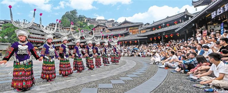 10月2日,游客在贵州省黔东南苗族侗族自治州雷山县西江千户苗寨景区观看民族歌舞表演。节日期间,该景区推出一系列民俗文化活动,并新增了“夜间旅拍”等新业态,增强游客的体验感。