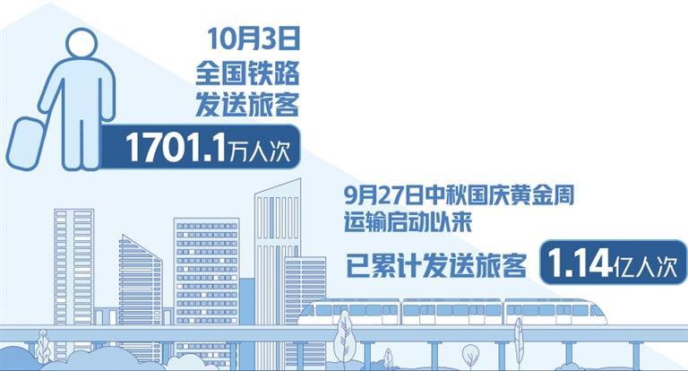 本报北京10月4日讯(记者齐慧)记者从中国国家铁路集团有限公司获悉,10月3日,全国铁路发送旅客1701.1万人次,连续6天单日旅客发送量超1600万人次。9月27日中秋国庆黄金周运输启动以来,已累计发送旅客1.14亿人次,运输安全平稳有序。10月4日,全国铁路客流继续保持高位运行,中短途客流增加,预计发送旅客1730万人次,计划开行旅客列车11679列,其中加开列车1260列。