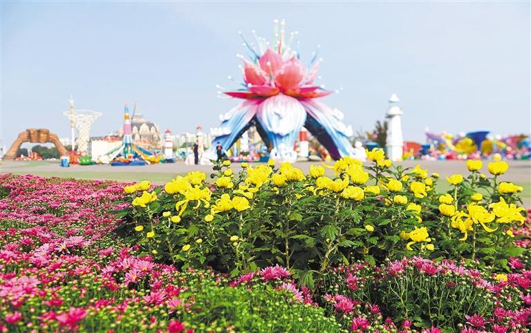 ⑥山东省青岛西海岸金沙滩,盛开的菊花与海洋公园主题彩灯相映成景,为市民提供假日休闲好去处。