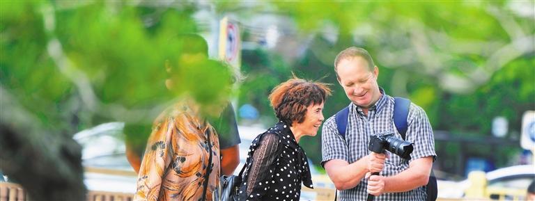 ④北京市东单,外国游客正在展示拍摄的“共同富裕”花坛照片。刘月杨摄(中经视觉)