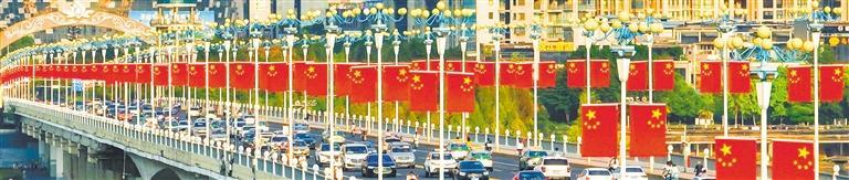 ①四川省遂宁市城区通德大桥上悬挂鲜艳的五星红旗,用“中国红”表达对祖国的美好祝愿。