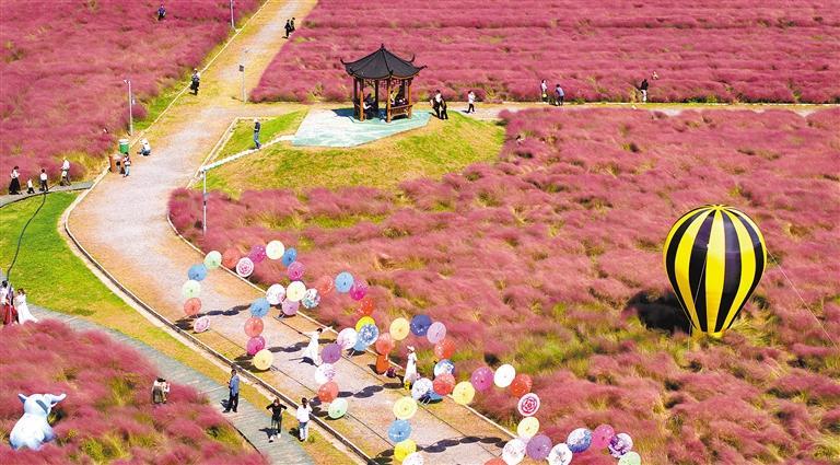 10月5日,南京八卦洲陌上花渡,游客在粉黛乱子草丛中游玩。中秋国庆假期,南京八卦洲陌上花渡内种植的粉黛乱子草进入最佳观赏期,吸引全国各地游客前来观赏打卡。苏 阳摄(中经视觉)