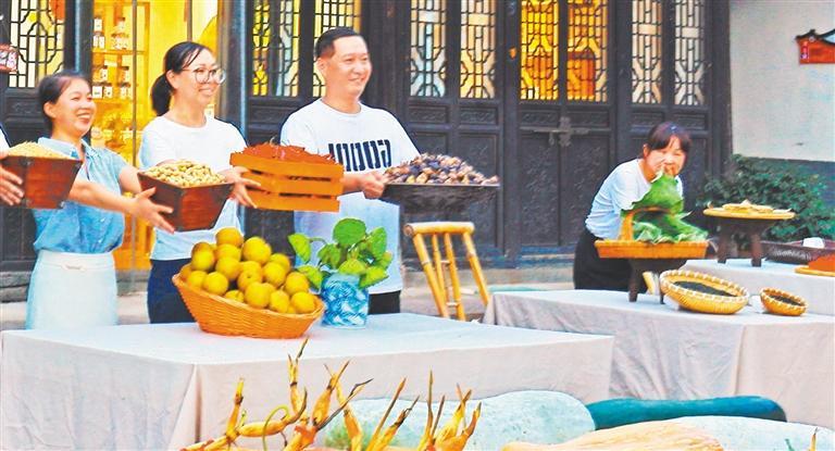 ④游客在浙江省义乌市李祖村创意集市展示丰收的果实。 龚献明摄(中经视觉)