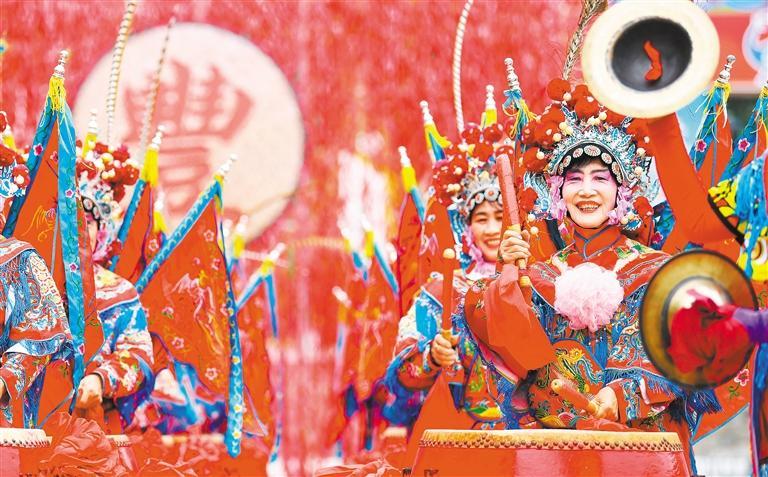 ③河北省迁安市杨店子街道,来自唐山的威风锣鼓队敲起锣鼓庆丰收。张泽慧摄(中经视觉)