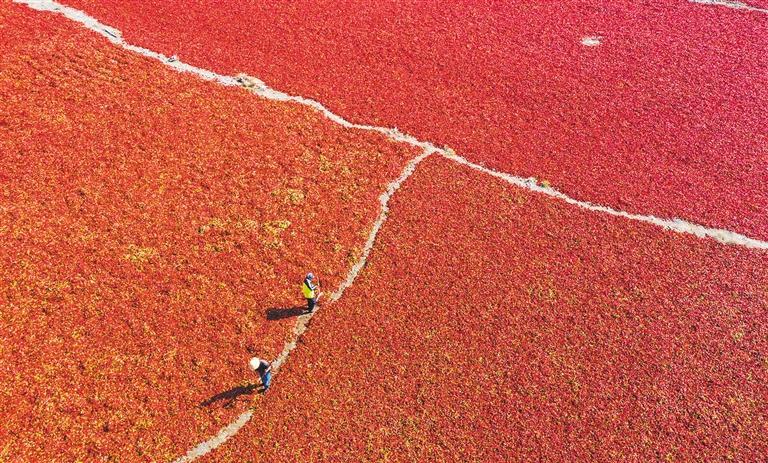 ②新疆维吾尔自治区昌吉市二六工镇红星村,村民在晾晒辣椒。何 龙摄(中经视觉)
