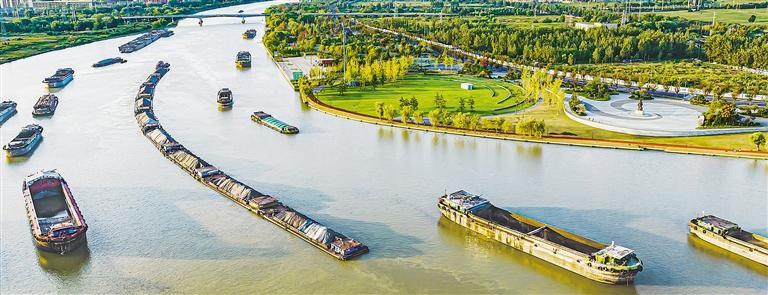 京杭大运河江苏省宿迁市宿城段,装载化肥、种子、煤炭、建材的货船来往如梭,一派繁忙景象。