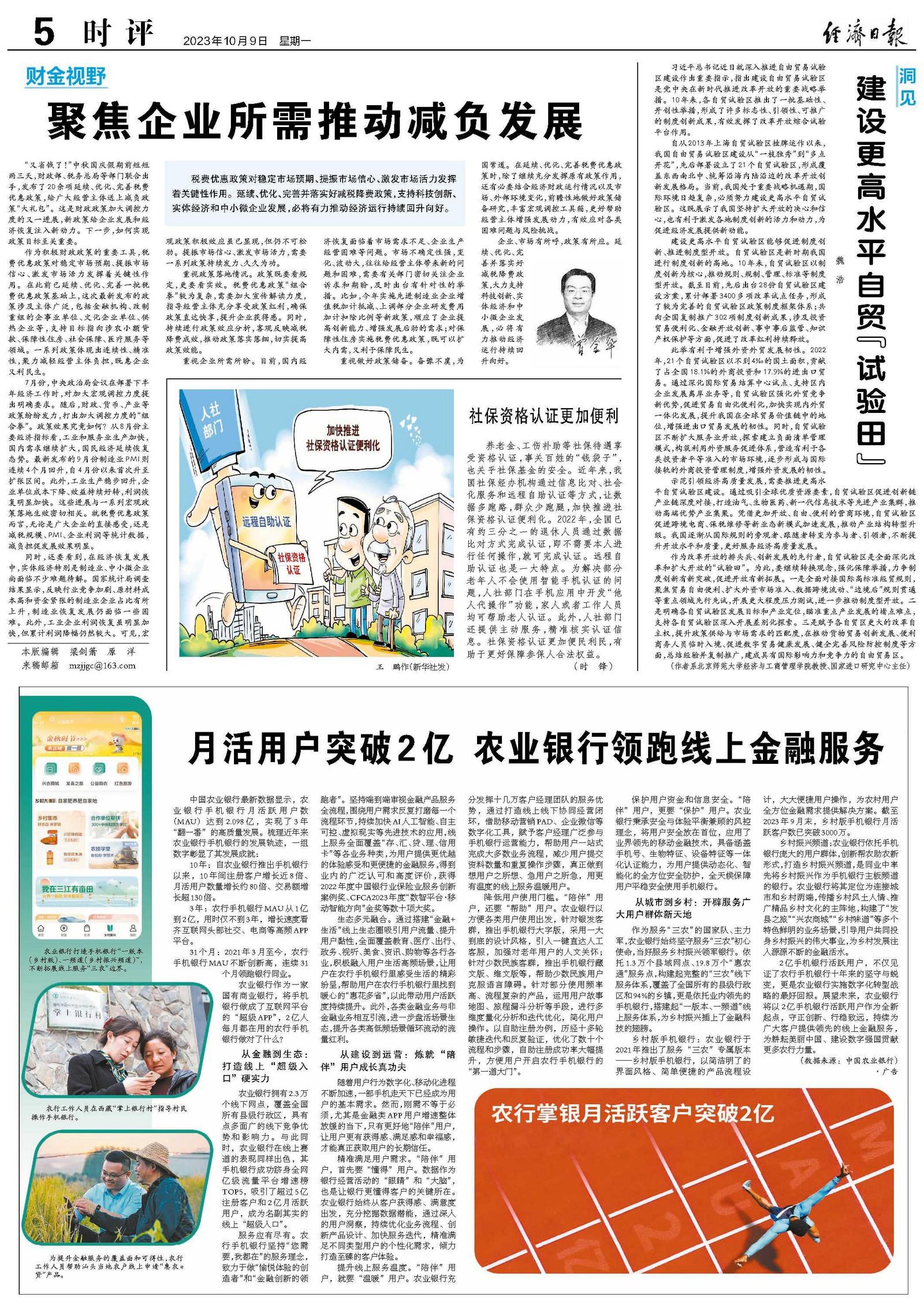 乡村版手机银行:农业银行于2021年推出了服务“三农”专属版本——乡村版手机银行,以简洁明了的界面风格、简单便捷的产品流程设计,大大便捷用户操作,为农村用户全方位金融需求提供解决方案。截至2023年9月末,乡村版手机银行月活跃客户数已突破3000万。