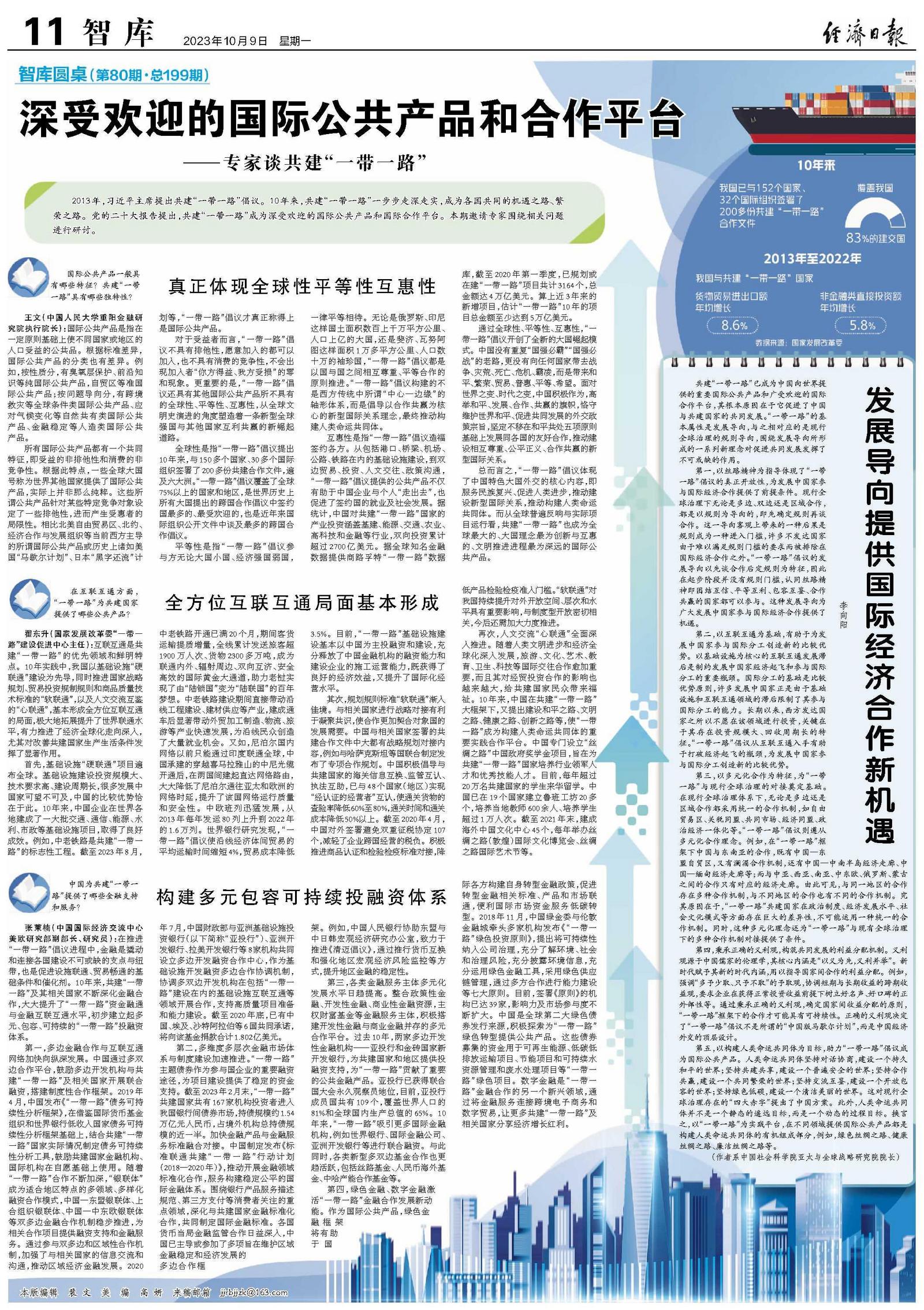 翟东升(国家发展改革委“一带一路”建设促进中心主任):互联互通是共建“一带一路”的优先领域和鲜明特点。10年实践中,我国以基础设施“硬联通”建设为先导,同时推进国家战略规划、贸易投资规制规则和商品质量技术标准的“软联通”,以及人文交流互鉴的“心联通”,基本形成全方位互联互通的局面,极大地拓展提升了世界联通水平,有力推进了经济全球化走向深入,尤其对改善共建国家生产生活条件发挥了显著作用。