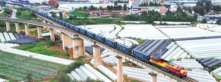 “沪滇·澜湄线”国际货运班列从昆明王家营西集装箱中心站驶出。