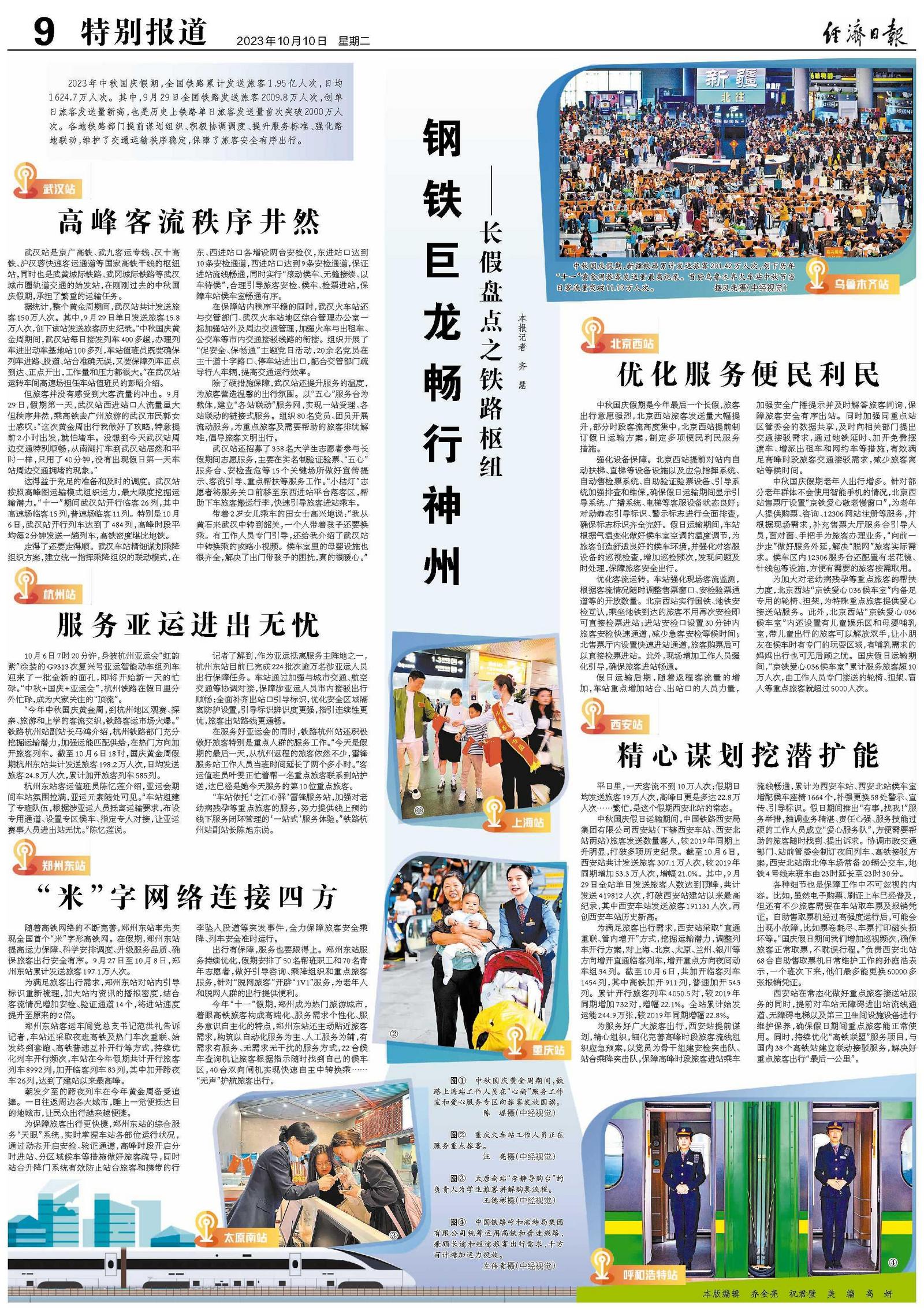 2023年中秋国庆假期,全国铁路累计发送旅客1.95亿人次,日均1624.7万人次。其中,9月29日全国铁路发送旅客2009.8万人次,创单日旅客发送量新高,也是历史上铁路单日旅客发送量首次突破2000万人次。各地铁路部门提前谋划组织、积极协调调度、提升服务标准、强化路地联动,维护了交通运输秩序稳定,保障了旅客安全有序出行。