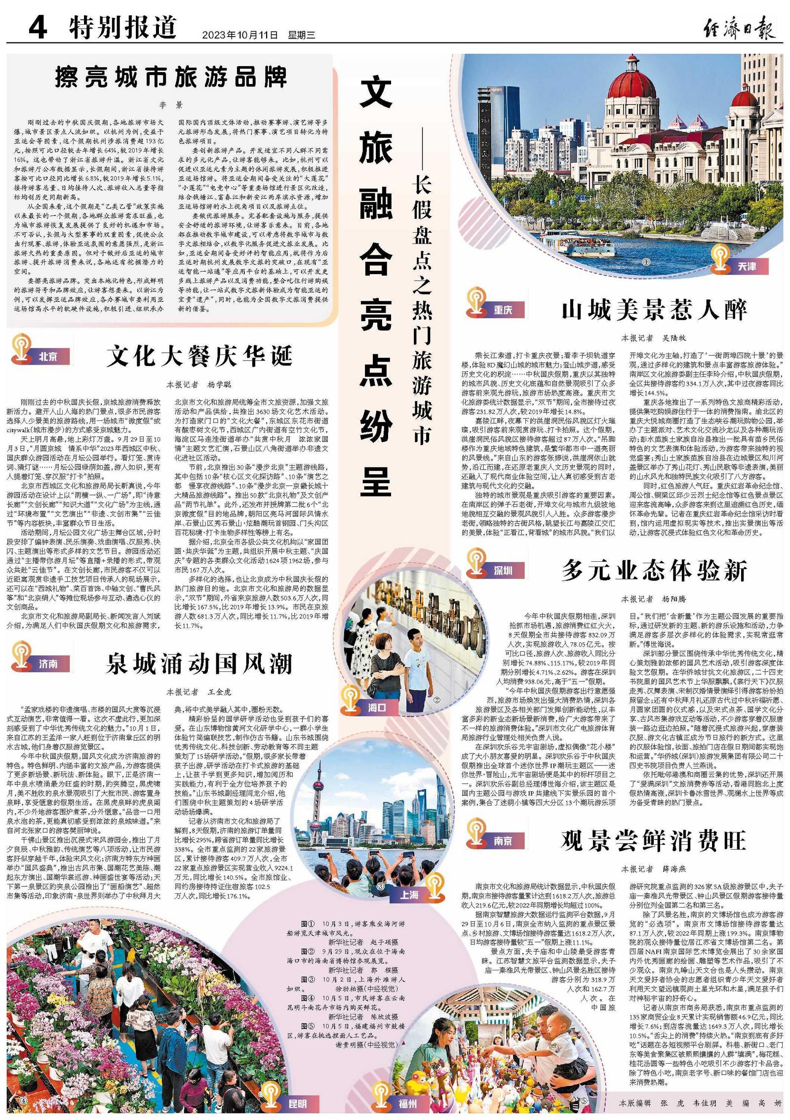 南京市文化和旅游局统计数据显示,中秋国庆假期,南京市接待游客量累计达到1618.2万人次,旅游总收入219.6亿元,较2022年同期增长均超过100%。