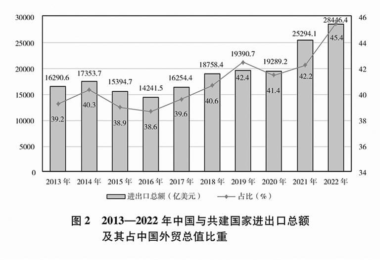 贸易投资规模稳步扩大。2013—2022年,中国与共建国家进出口总额累计19.1万亿美元,年均增长6.4%;与共建国家双向投资累计超过3800亿美元,其中中国对外直接投资超过2400亿美元;中国在共建国家承包工程新签合同额、完成营业额累计分别达到2万亿美元、1.3万亿美元。2022年,中国与共建国家进出口总额近2.9万亿美元,占同期中国外贸总值的45.4%,较2013年提高了6.2个百分点;中国民营企业对共建国家进出口总额超过1.5万亿美元,占同期中国与共建国家进出口总额的53.7%。