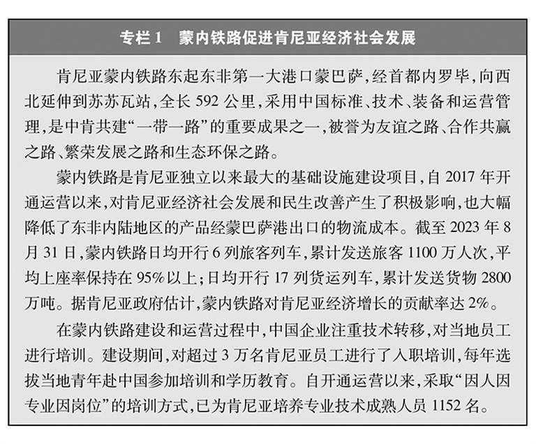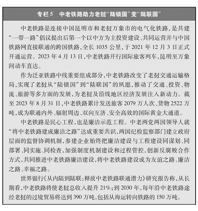 经济走廊和国际通道建设卓有成效。共建国家共同推进国际骨干通道建设,打造连接亚洲各次区域以及亚欧非之间的基础设施网络。中巴经济走廊方向,重点项目稳步推进,白沙瓦—卡拉奇高速公路(苏库尔至木尔坦段)、喀喇昆仑公路二期(赫韦利扬—塔科特段)、拉合尔轨道交通橙线项目竣工通车,萨希瓦尔、卡西姆港、塔尔、胡布等电站保持安全稳定运营,默拉直流输电项目投入商业运营,卡洛特水电站并网发电,拉沙卡伊特别经济区进入全面建设阶段。新亚欧大陆桥经济走廊方向,匈塞铁路塞尔维亚贝尔格莱德—诺维萨德段于2022年3月开通运营,匈牙利布达佩斯—克莱比奥段启动轨道铺设工作;克罗地亚佩列沙茨跨海大桥迎来通车一周年;双西公路全线贯通;黑山南北高速公路顺利建成并投入运营。中国—中南半岛经济走廊方向,中老铁路全线建成通车且运营成效良好,黄金运输通道作用日益彰显;作为中印尼共建“一带一路”的旗舰项目,时速350公里的雅万高铁开通运行;中泰铁路一期(曼谷—呵叻)签署线上工程合同,土建工程已开工11个标段(其中1个标段已完工)。中蒙俄经济走廊方向,中俄黑河公路桥、同江铁路桥通车运营,中俄东线天然气管道正式通气,中蒙俄中线铁路升级改造和发展可行性研究正式启动。中国—中亚—西亚经济走廊方向,中吉乌公路运输线路实现常态化运行,中国—中亚天然气管道运行稳定,哈萨克斯坦北哈州粮油专线与中欧班列并网运行。孟中印缅经济走廊方向,中缅原油和天然气管道建成投产,中缅铁路木姐—曼德勒铁路完成可行性研究,曼德勒—皎漂铁路启动可行性研究,中孟友谊大桥、多哈扎里至科克斯巴扎尔铁路等项目建设取得积极进展。在非洲,蒙内铁路、亚吉铁路等先后通车运营,成为拉动东非乃至整个非洲国家纵深发展的重要通道。